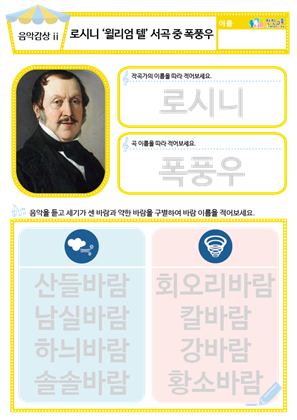 [음악감상] 드뷔시 ‘서풍이 본 것’ 동요/음원 , 활동지 [음악감상] 로시니 ‘윌리엄 텔’ 서곡 중 폭풍우 동요/음원 , 활동지 |
