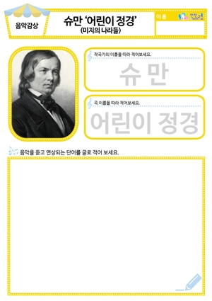 [새노래] 내가 제일 좋아하는 말 동요/음원 [새노래] 어린이날 동요/음원 [음악감상] 슈만 ‘어린이 정경(미지의 나라들)’ 동요/음원 , 활동지 |
