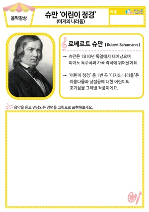 [새노래] 내가 제일 좋아하는 말 동요/음원 [새노래] 어린이날 동요/음원 [음악감상] 슈만 ‘어린이 정경(미지의 나라들)’ 동요/음원 , 활동지 |