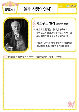 [새노래] 예쁜 손 동요/음원 [음악감상] 엘가 ‘사랑의 인사’ 도안 , 동요/음원 , 활동지 [음악감상] 마르티니 ‘사랑의 기쁨’ 동요/음원 , 활동지 |
