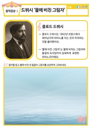 [음악감상] 슈베르트 ‘환상의 태양’ 동요/음원 , 활동지 [음악감상] 드뷔시 ‘물에 비친 그림자’ 동요/음원 , 활동지 |